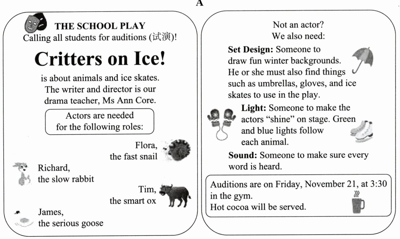 Set Design: Someone to draw fun winter backgrounds. He or she must also find things such as umbrellas, gloves, and ice skates to use in the play.
