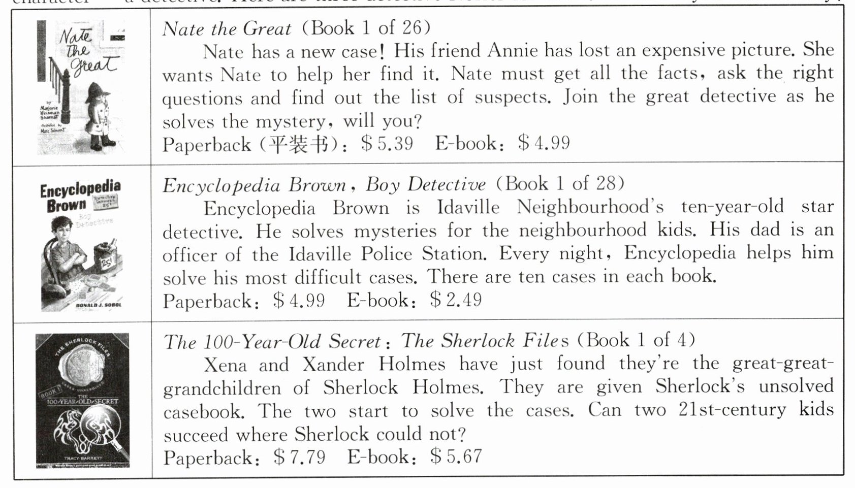 许多青少年喜欢侦探故事。他们喜欢和主角——一名侦探一起探寻幕后真相。这里有三个适合青少年的侦探故事。你想买哪一个呢?