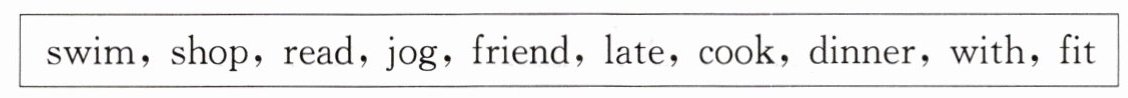 | 游泳 | 购物 | 阅读 | 慢跑 | 朋友 | 晚,迟 | 烹饪 | 晚餐 | 和……一起 | 健康的,健壮的 |