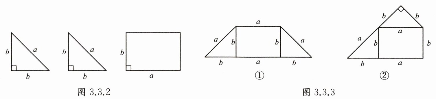 用图3.3.2中的三张卡片可以拼成形状不同的四边形.现拼成如图3.3.3中图①、图②所示的两种不同的四边形.