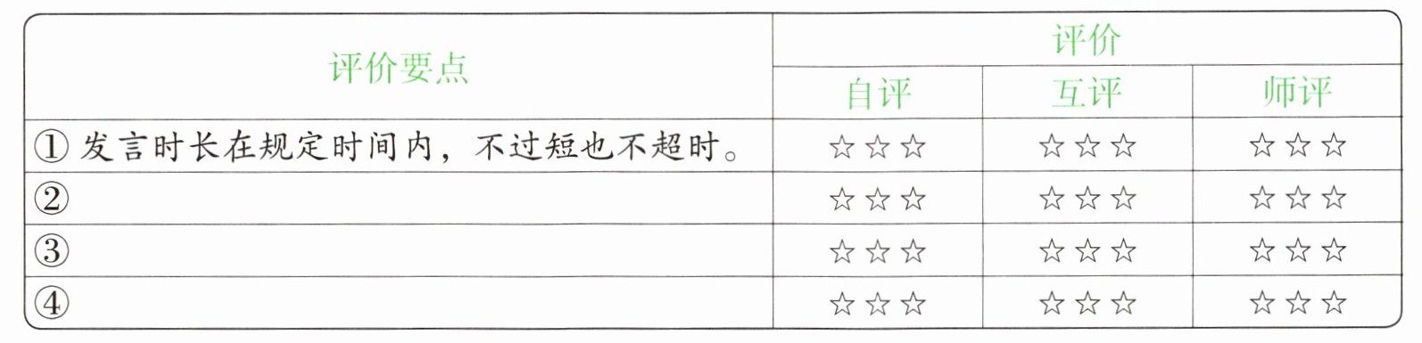 4.老师请你补拟三个评价要点,帮大家评价“展风采”自我介绍活动中的发言表现。(3分)
