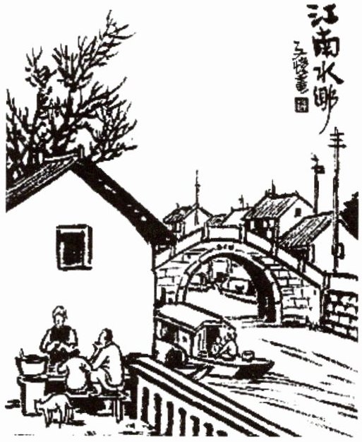 丰子恺先生的《江南水乡》静静铺展在纸上,墨色的石桥如弯月卧波,乌篷船摇碎水面的光影,两位老人坐在石阶上闲话家常,黄狗蜷在脚边打盹。这黑白线条勾勒的画面,像一坛封存的老酒,开封时便涌出我记忆里外婆家的水乡气息。