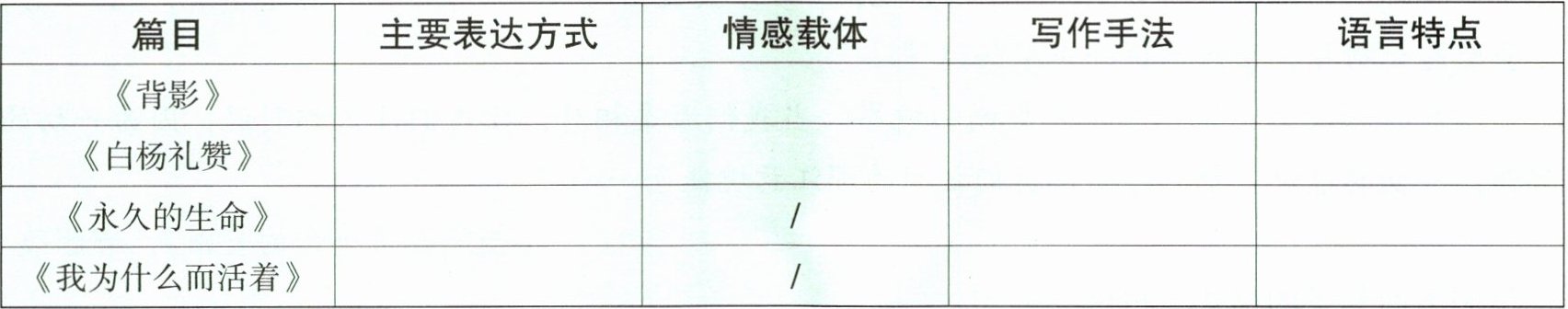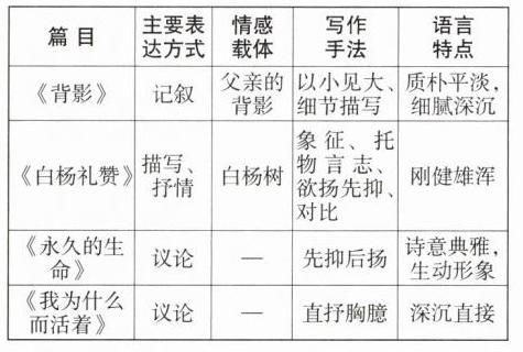 |篇目|主要表达方式|情感载体|写作手法|语言特点|