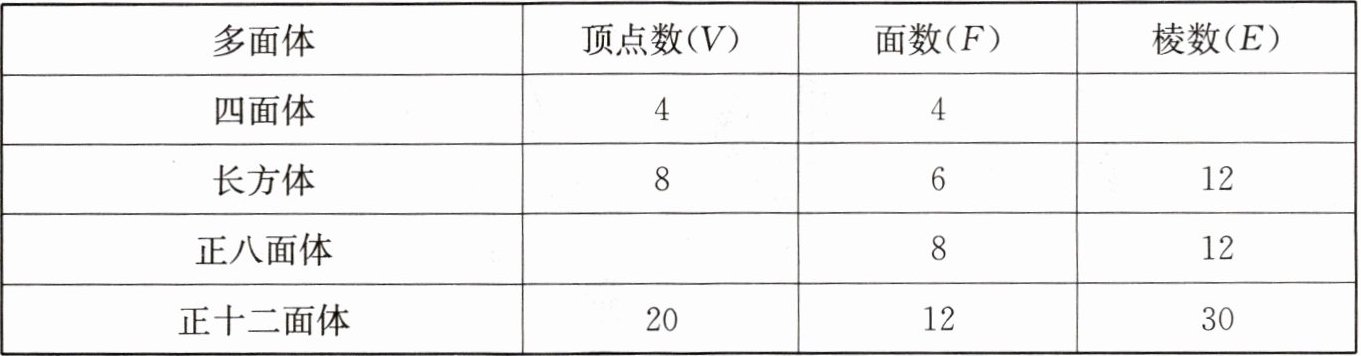 .你发现顶点数($V$)、面数($F$)、棱数($E$)之间存在的关系式是