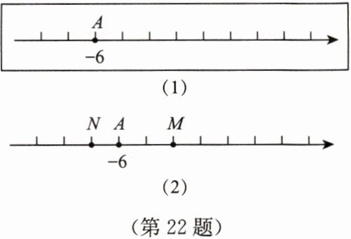22. (8 分)如图(1),电脑显示屏上画出了一条不完整的数轴,并标出了表示-6 的点 A. 小明同学设计了一个电脑程序:点 M,N 分别从点 A 同时出发,每按一次键盘,点 M 向右移动 2 个单位长度,点 N 向左移动 1 个单位长度. 例如,第一次按键后,屏幕显示点 M,N 的位置如图(2)所示.