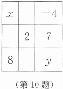 10. 幻方最早起源于我国,古人称之为纵横图。如图所示的幻方中,每一行、每一列及各条对角线上的三个数之和均相等,则 $ x - y$ 的值为