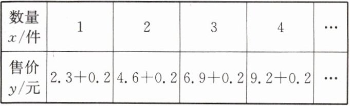 21. (8 分)某商店出售一种商品,其数量 $ x $ 与售价 $ y $ 之间的关系如下表(表中 0.2 是包装费):