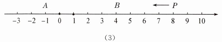 (3)如图(3),$ A $,$ B $,$ P $ 为数轴上三点,点 $ A $ 所表示的数为 $ -1 $,点 $ B $ 所表示的数为 4,点 $ P $ 所表示的数为 8. 现有一只电子蚂蚁从点 $ P $ 出发,以 2 个单位/秒的速度向左运动,当经过多少秒时,电子蚂蚁是点 $ A $ 和 $ B $ 的“幸福中心”?