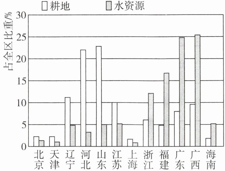 我国水土资源配合不佳,是导致农业缺水的重要原因。下图为我国12个省级行政区耕地、水资源占全区的比重图。据此完成7~8题。