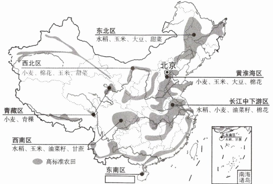 (1)仿照图例,补充完善东南区高标准农田主要农作物。(任答一种)(2 分)