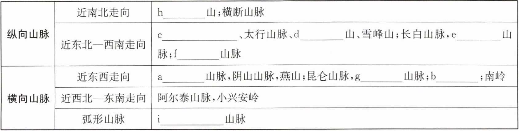 平原。答案:1.贺兰 大兴安岭 巫 武夷 台湾 天山 祁连 秦岭 喜马拉雅 2.青藏 内蒙古 云贵 黄土
