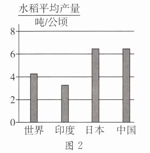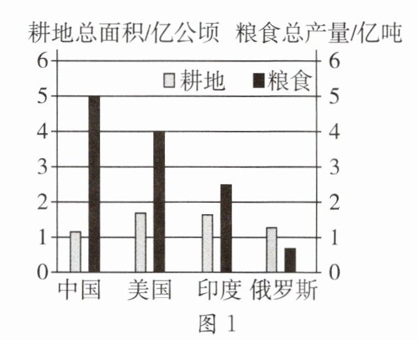 1. 我国用世界7%的耕地,养活了世界22%的人口,创造了世界奇迹。图1为四国耕地总面积和粮食总产量柱状图,图2为世界部分国家单位面积水稻平均产量图。读图可知(
