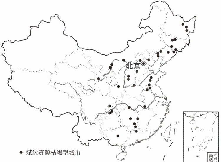 长期以来,我国能源以煤炭为主,许多城市因煤而兴。由于煤炭资源长期被开采而进入衰退或枯竭阶段,一些城市成为煤炭资源枯竭型城市。下图示意中国煤炭资源枯竭型城市的分布。