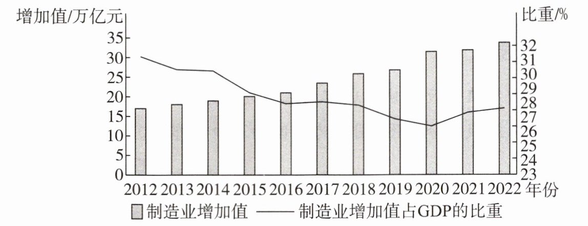 (2)制造业增加值逐年增加;制造业增加值占GDP的比重整体下降。