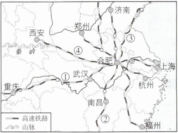近年来,我国高速铁路发展迅速,“八纵八横”高速铁路网已初见端倪,逐步形成了郑州、西安、合肥、重庆等“米”字形高速铁路枢纽城市。下图是合肥“米”字形高速铁路线路分布示意图。据此完成4~5题。
