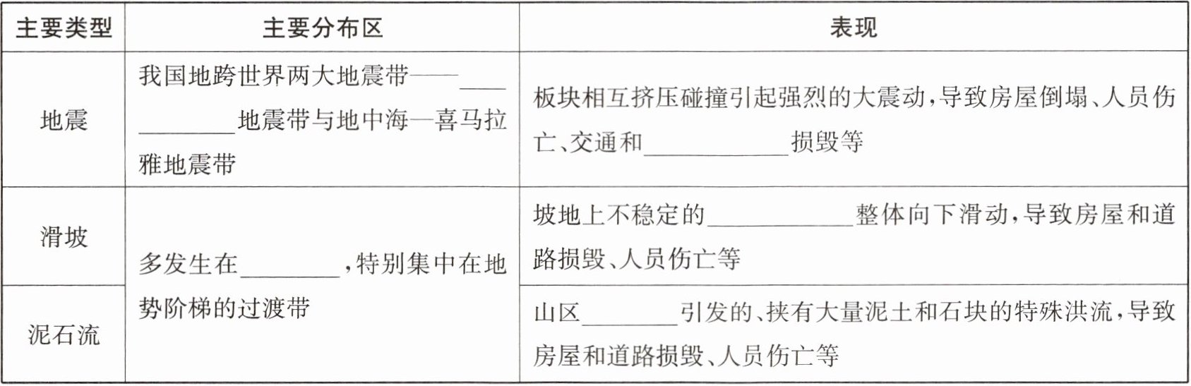 整体向下滑动,导致房屋和道路损毁、人员伤亡等||泥石流| |山区
