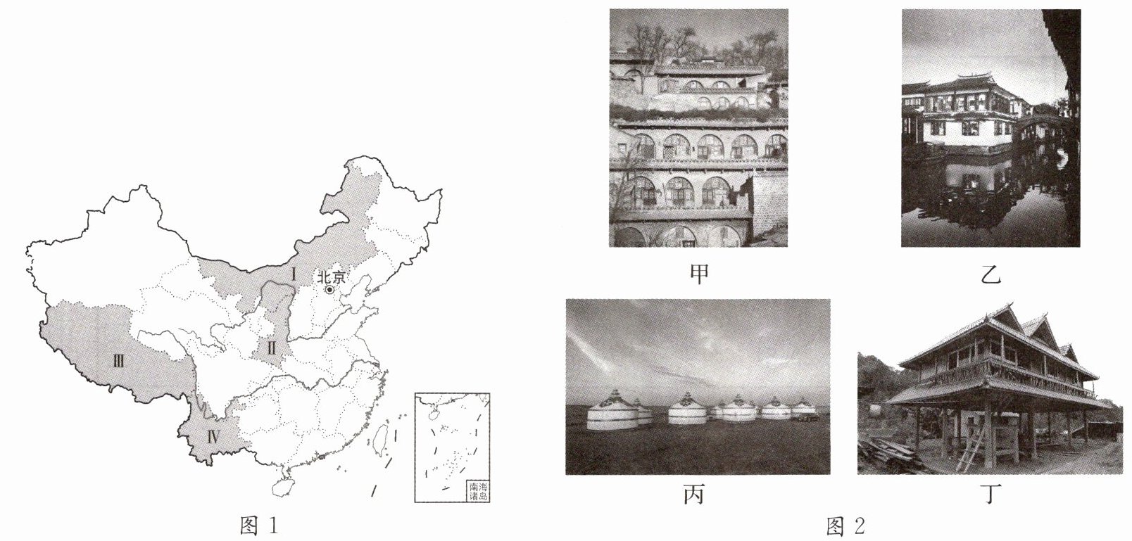 我国地域辽阔,传统文化呈现诸多差异。图 1 为我国行政区划简图,图 2 为我国四种传统民居示意图。据此完成 8~9 题。