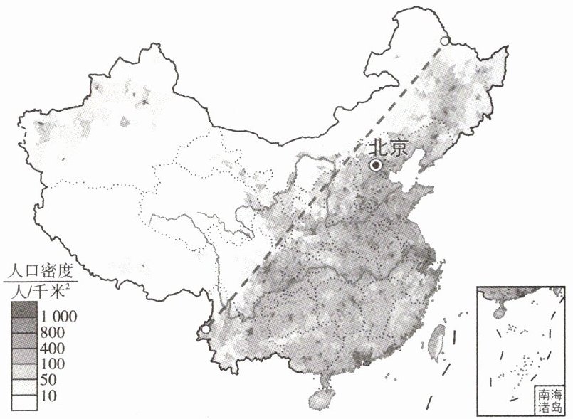 1935年,中国地理学家胡焕庸提出了我国人口地理分界线,总结出了我国人口分布规律,其所揭示的人口分布格局,至今仍具现实意义。右图示意我国人口分布和人口地理分界线位置。据此完成3~4题。