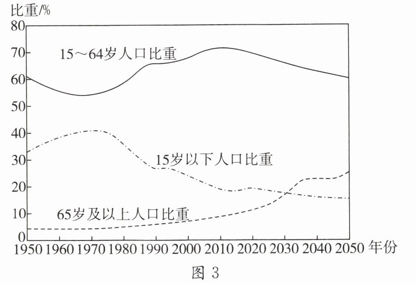 (填省级行政区简称)。(4 分)“人口红利”是指一个国家的劳动年龄(15~64 岁)人口占总人口比重较大,为经济发展创造有利的人口条件。图 3 为我国人口年龄结构变化(含预测)图。