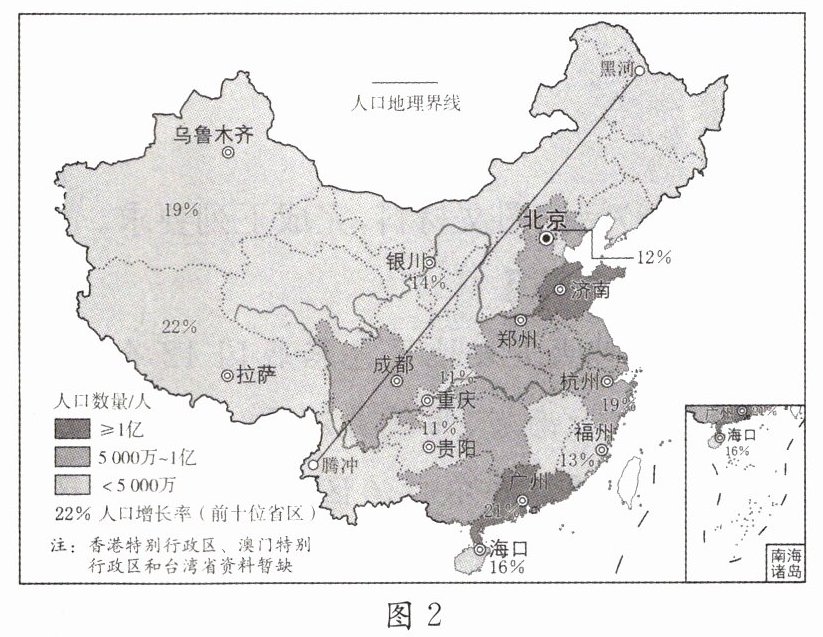 (2)读图 2 可知,我国人口分布的特点是