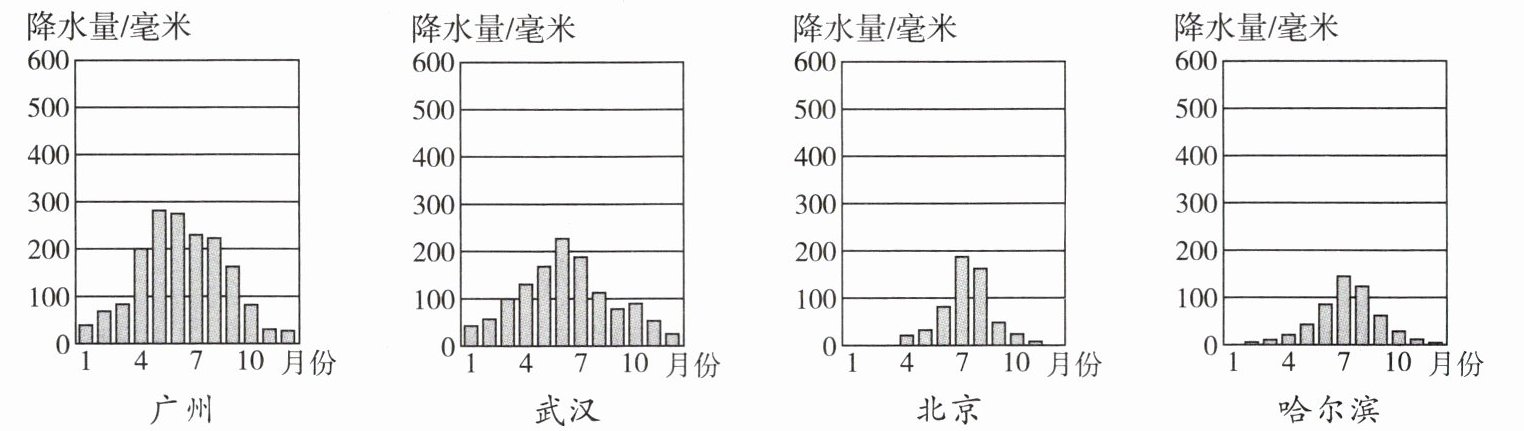 我国季风气候显著,受夏季风影响,我国雨带呈现季节性移动。读我国四个城市的降水量逐月分配柱状图,完成12~13题。