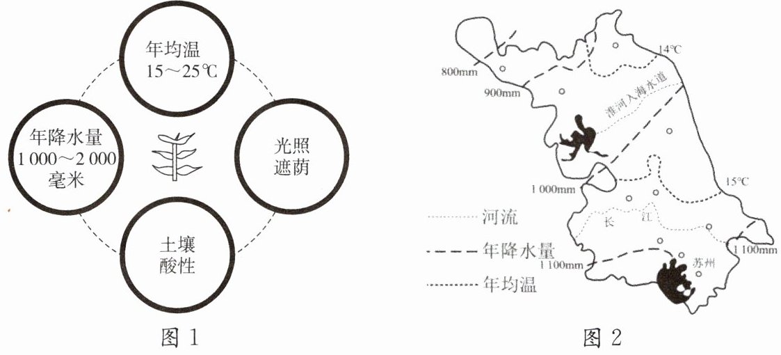 茶蕴含着中华文化,江苏绿茶享誉海外。图1为茶树适宜生长条件示意图,图2为江苏省气温和降水量分布图。据此完成14~15题。