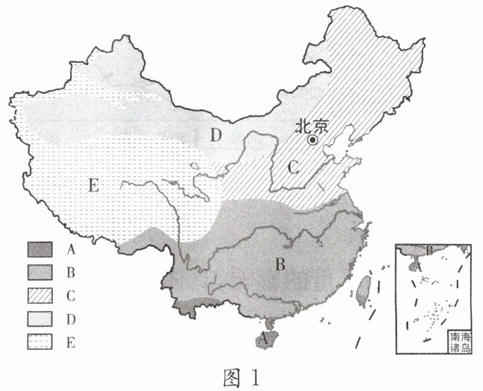 (2)我国地域辽阔,气候类型多样,在图1中,A代表的气候类型为