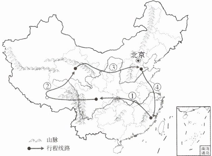 暑假期间,贝贝一家出门旅游,感受祖国大好河山的魅力。下图示意旅游线路,读图并帮助贝贝完成地理见闻记录。