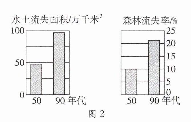 某中学的研学小组以“长江经济带的可持续发展”为研究课题,沿长江进行研学旅行。图1为长江流域水系图,图2为长江流域20世纪不同年代水土流失面积和森林流失率统计图。