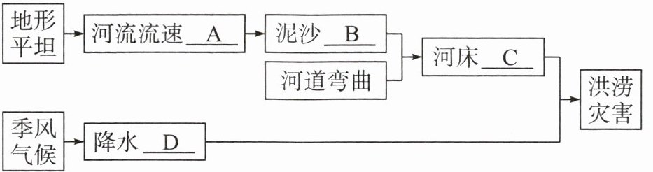 (2)丙河段历史上多发洪涝灾害,请帮助研学小组完成下面的知识结构图。