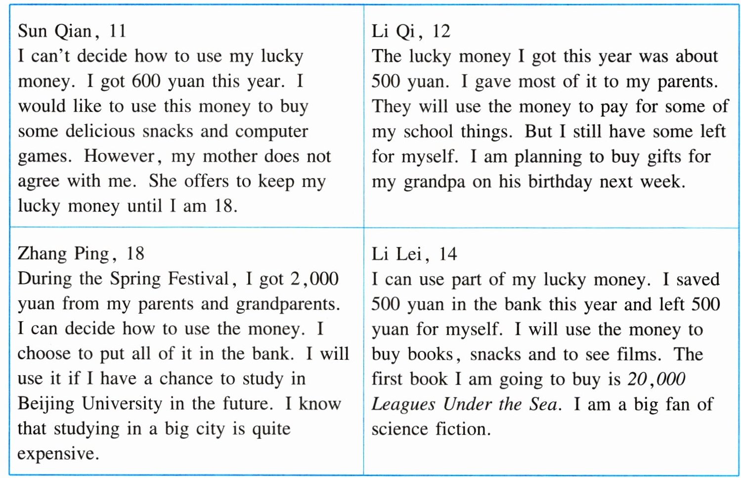 Receiving lucky money during the Spring Festival is a tradition in China. Many teenagers get lucky money from family members. Here are four examples: