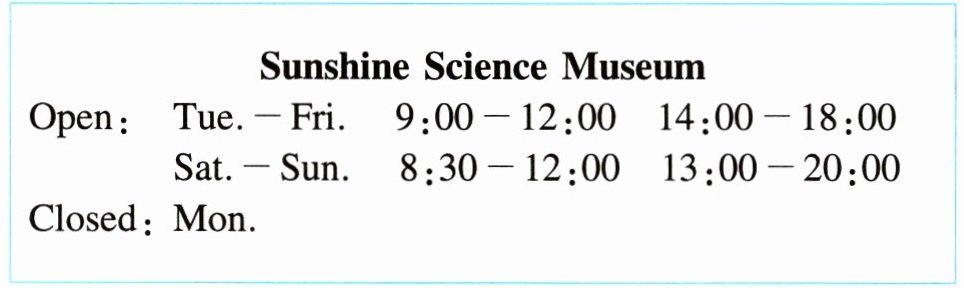 ) 1. How long is Sunshine Science Museum open on Thursday afternoon?Sunshine Science Museum