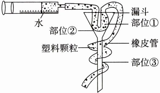 16. 某同学利用橡皮管、漏斗、水、塑料颗粒、注射器等材料制作了肾单位模型(如右下图所示,塑料颗粒不能透过橡皮管),模拟尿的形成过程。下列相关叙述错误的是( )