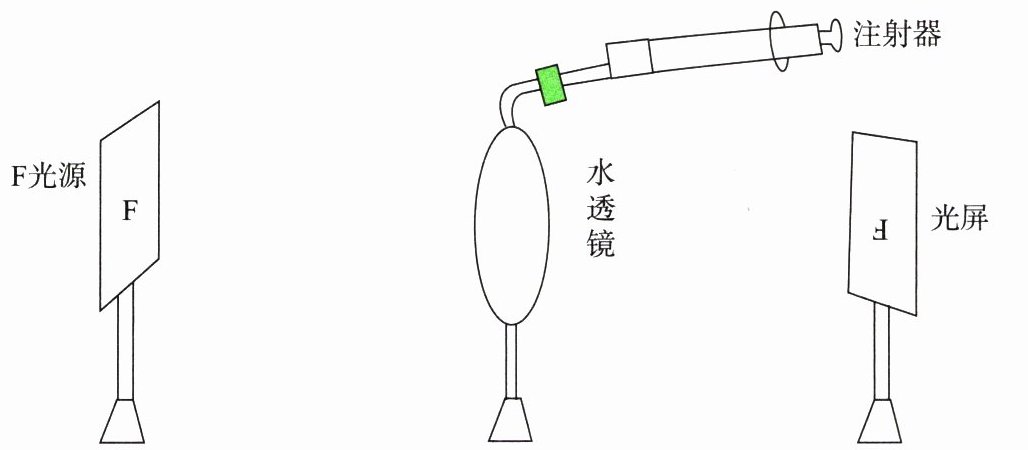 (3)若将 F 光源向左移动,发现光屏上的像变得模糊,为了使物像变得清晰,使用注射器调节,使水透镜的曲度变______,此时注射器模拟眼球的______结构;或者在水透镜与 F 光源之间放置一个______透镜,模拟______视眼镜。
