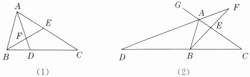 (2)图(2)中,作$\triangle ABC的外角\angle BAG的角平分线AD$所在的直线,分别交$CB$,$BE的延长线于D$,$F$两点,试探究(1)中结论是否仍成立。为什么?