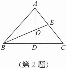 2. 如图,点O是△ABC的重心,连接AO并延长交BC于点D. 连接BO并延长交AC于点E,则下列说法一定正确的是(