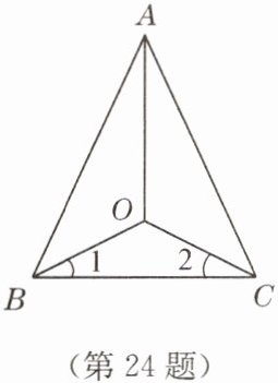 24. (8 分)已知:如图,$ O $ 为 $ \triangle A B C $ 的 $ \angle B A C $ 的角平分线上一点,$ \angle 1 = \angle 2 $,求证:$ \triangle A B C $ 是等腰三角形.