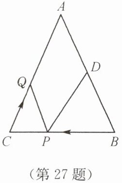 27. (16 分)如图,已知 $ \triangle A B C $ 中,$ \angle B = \angle C $,$ A B = 8 \mathrm { cm } $,$ B C = 6 \mathrm { cm } $,点 $ D $ 为 $ A B $ 的中点. 如果点 $ P $ 在线段 $ B C $ 上以每秒 $ 2 \mathrm { cm } $ 的速度由点 $ B $ 向点 $ C $ 运动,同时,点 $ Q $ 在线段 $ C A $ 上以每秒 $ a \mathrm { cm } $ 的速度由点 $ C $ 向点 $ A $ 运动,设运动时间为 $ t ( \mathrm { s } ) $($ 0 \leqslant t \leqslant 3 $).