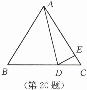 20. (7 分)如图,在 $\triangle ABC$ 中,$\angle B = \angle C$,$\angle CDE = 20^{\circ}$,且 $\angle ADE = \angle AED$,求 $\angle BAD$ 的度数。