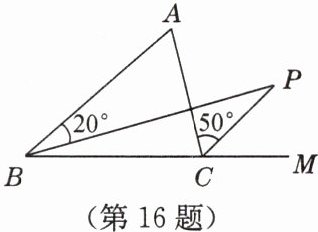 16. 如图,$BP$ 是 $\triangle ABC$ 中 $\angle ABC$ 的平分线,$CP$ 是 $\angle ACB$ 的外角的平分线,如果 $\angle ABP = 20^{\circ}$,$\angle ACP = 50^{\circ}$,则 $\angle A + \angle P = $