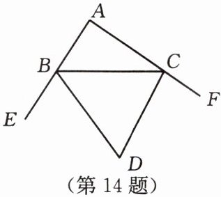 14. 如图,在 $\triangle ABC$ 中,$\angle A = 80^{\circ}$,$\angle ABC$,$\angle ACB$ 的外角平分线交于点 $D$,那么 $\angle BDC = $