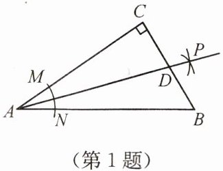1. 如图,在$Rt\triangle ABC$中,$\angle C = 90^{\circ}$,以顶点$A$为圆心,适当长为半径画弧,分别交$AC$,$AB于点M$,$N$,再分别以点$M$,$N$为圆心,大于$\frac{1}{2}MN$的长为半径画弧,两弧交于点$P$,作射线$AP交边BC于点D$,若$CD = 4$,$AB = 15$,则$\triangle ABD$的面积是(