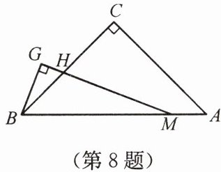 8. 如图,在$\triangle ABC$中,$\angle C = 90^{\circ}$,$CA = CB$,点$M在线段AB$上,$\angle GMB= \frac{1}{2}\angle A$,$BG\perp MG$,垂足为$G$,$MG与BC相交于点H$. 若$MH = 8\,cm$,求$BG$的长.