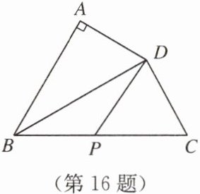 16. 如图,在四边形 $ ABCD $ 中,$ \angle A = 90^{\circ} $,$ AD = 3 $,连接 $ BD $,$ BD \perp CD $,$ \angle ADB = \angle C $,若 $ P $ 是 $ BC $ 边上一动点,则 $ DP $ 长的最小值为