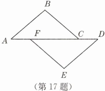 17. (8 分)如图,点 $ A $,$ F $,$ C $,$ D $ 在同一条直线上,已知 $ AF = DC $,$ \angle A = \angle D $,$ BC // EF $,请写出 $ AB $ 与 $ DE $ 之间的关系并证明你的结论.