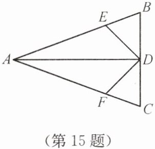 15. 如图,已知在 $ \triangle ABC $ 中,$ AB = AC $,$ AD $ 是角平分线,$ BE = CF $. 有下列说法:(1)$ DA $ 平分 $ \angle EDF $;(2)$ \triangle EBD \cong \triangle FCD $;(3)$ \triangle AED \cong \triangle AFD $. 其中正确的个数是