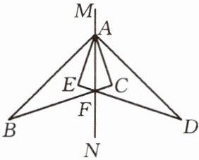 问题 如图,$\triangle ABC与\triangle ADE关于直线MN$对称,$BC与DE的交点F在直线MN$上。