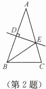 2. 如图,等腰 $ \triangle ABC $ 的底角为 $ 72^{\circ} $,腰 $ AB $ 的垂直平分线交另一腰 $ AC $ 于点 $ E $,垂足为 $ D $,连接 $ BE $,则 $ \angle EBC $ 的度数为