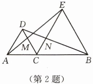 2. 如图,△DAC和△EBC均是等边三角形,AE,BD分别与CD,CE交于点M,N。现有如下结论:(1)△ACE≌△DCB;(2)CM= CN;(3)AC= DN。其中,正确结论的个数是(