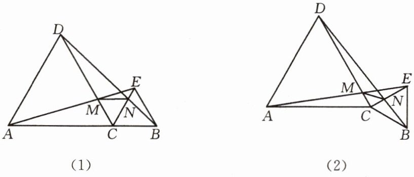 图(1):由(1)△ACE≌△DCB得∠CAM=∠CDN。